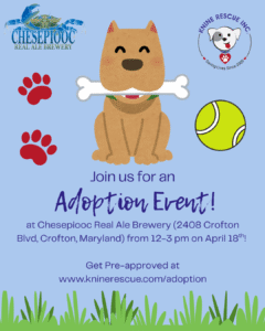 Join us at Chesepiooc Real Ale Brewery in Crofton, MD on April 18th from 12-3 pm for an adoption event!