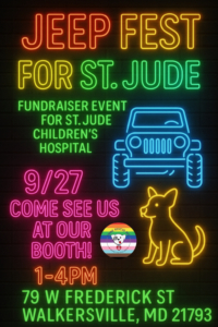 Join us Saturday September 27th at JEEP FEST for St. Jude! We will have a booth with adoptable dogs and we hope to see you there 1-4 pm (but Jeep fest runs until 7 pm).