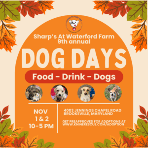 Join us for Dog Days at Sharp’s Farm on November 1st and 2nd! 10 am -5 pm! A TON OF ADOPTABLE DOGS! Visit our social media for attendance lists: https://www.instagram.com/kninerescueinc/